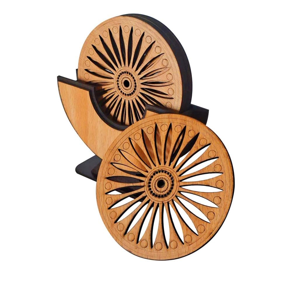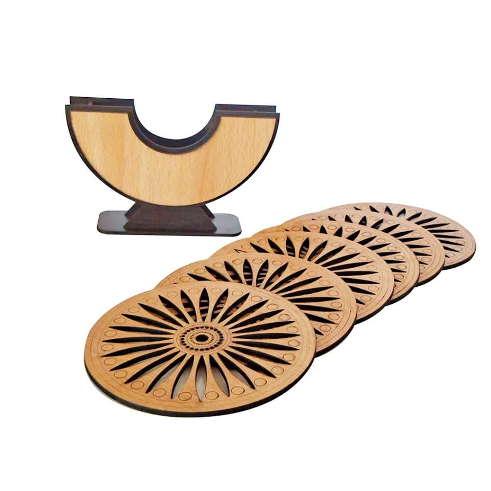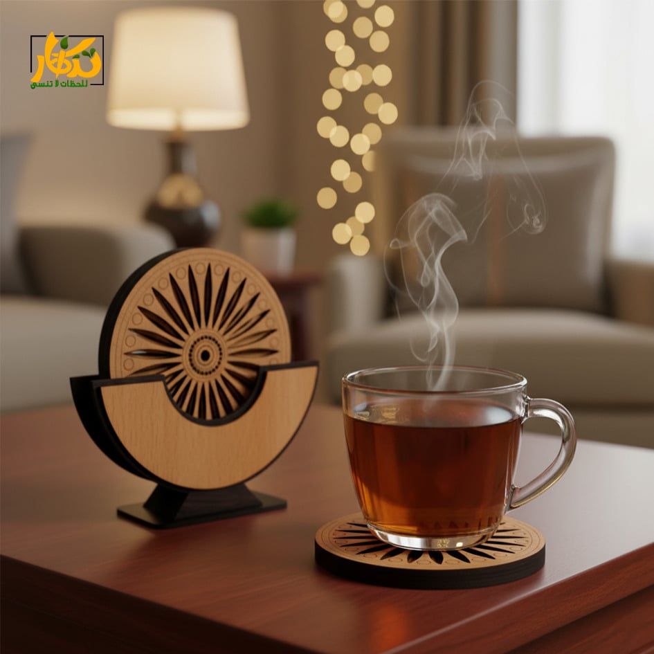 طقم كوستر خشبي دائري يتميز بنقوشه المفرغة التي تشبه أشعة الشمس أو عجلة عربة كلاسيكية